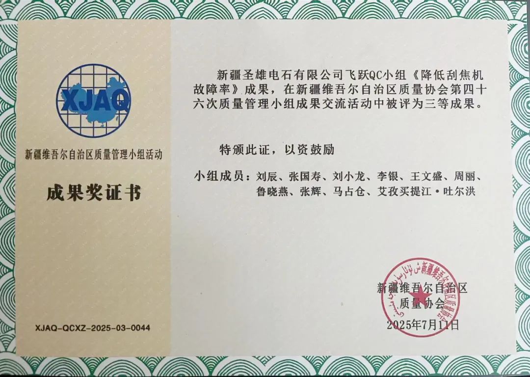 近日,圣雄能源电石公司飞跃QC小组“降低刮焦机故障率”成果,在新疆维吾尔自治区质量协会第四十六次质量管理小组成果交流活动中被评为三等奖。